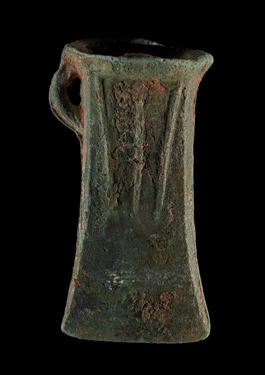 Discovered at the bottom of the ancient pit was a small axehead. It has sharp and jagged sides, an unworked blade, and four stumps around its socket mouth. These signs tell us that it was cast and never prepared for use. There are also two small holes through one of its faces – casting flaws that were probably caused by the molten bronze not being hot enough when it was poured. These casting defects may explain why this axehead was never used, but why was it buried and not recycled?
